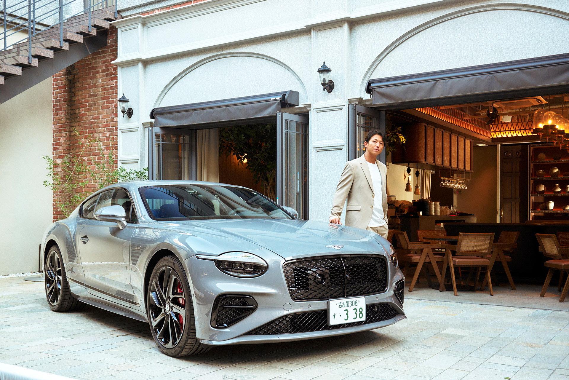 名古屋・伏見の洗練されたレストラン、グリリアパージナのレンガ造りの外観前に、「アズール」を特別展示。イタリアの邸宅をモチーフにしたこの空間は、まさにベントレーの持つヨーロピアンな気品と見事に調和します。都市の喧騒から少し離れた落ち着いた雰囲気の中で、新たなベントレーの魅力をゆっくりとご堪能いただけます。