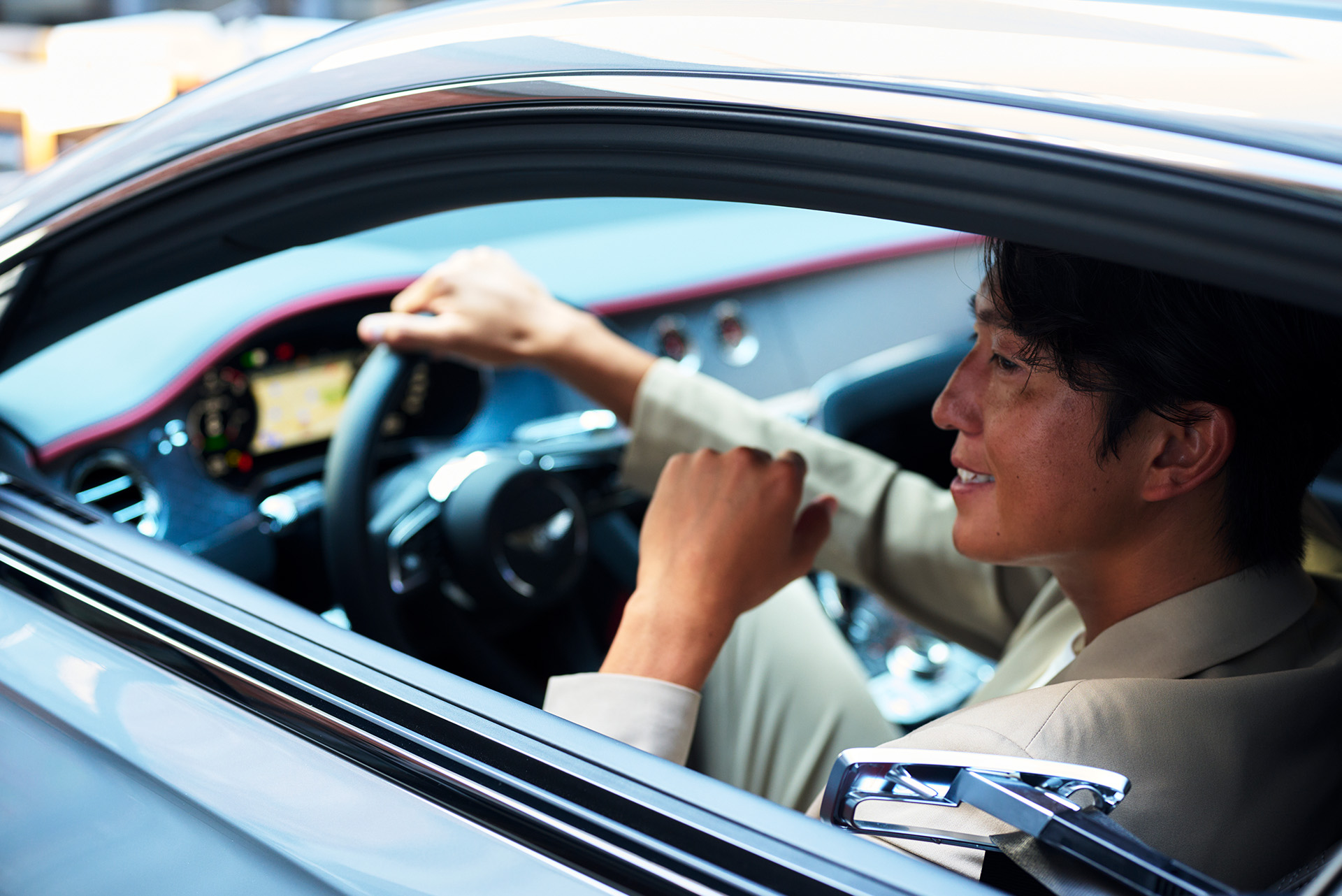 サーフィンをライフスタイルに取り入れ、自然と都会を自在に行き来する仁枝拳二氏。「常に魅せられるように気を張る」というプロ意識と、「海でも街でもカッコよく」というモットーは、ベントレー「アズール」が表現する"力強さと穏やかさの共存"を見事に映し出します。