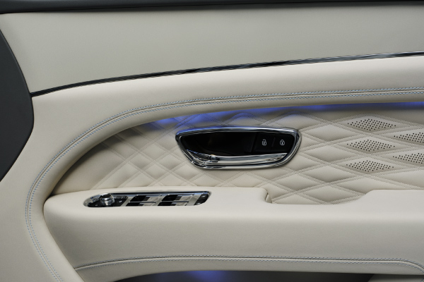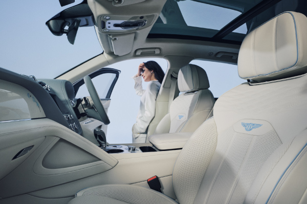さらに、「Something Blue」のテーマを象徴するライトブルーのアクセントを随所に配しています。シートおよびヘッドレストのパイピングとステッチ、ベントレーウィングの刺繍、ディープパイルのオーバーマットの縁取りに至るまで繊細なブルーをあしらい、クリーンな基調色の中に凛とした華やぎを添えています。